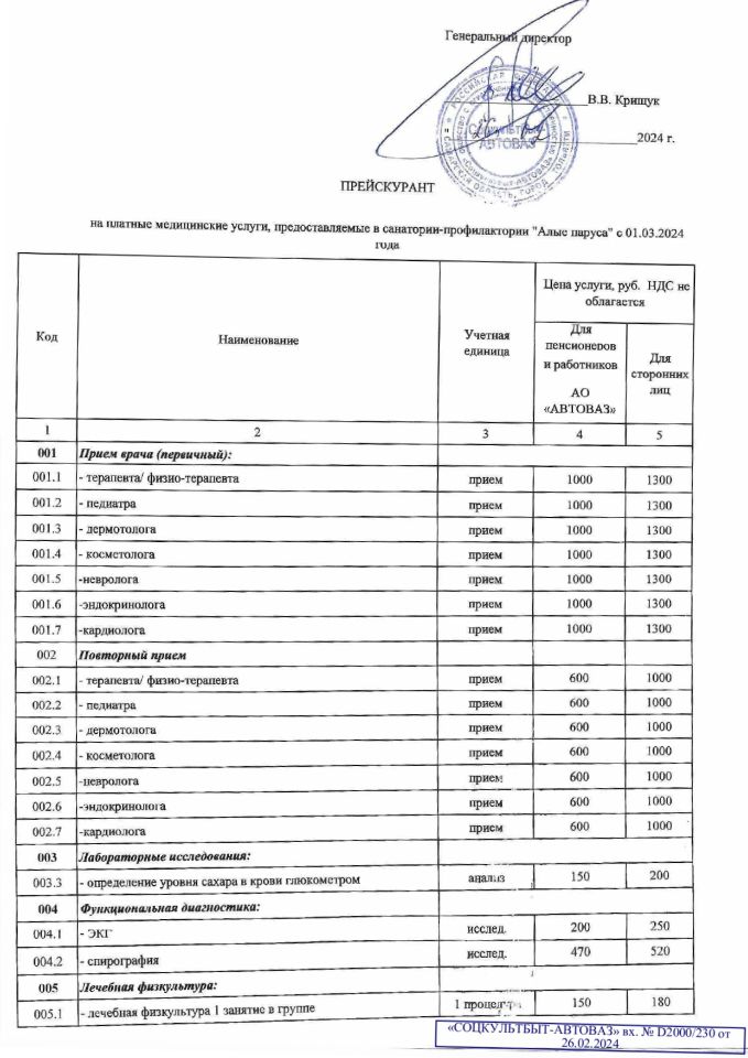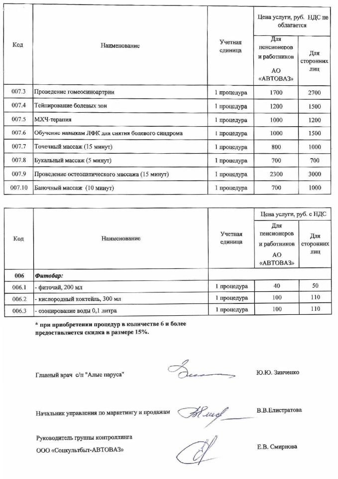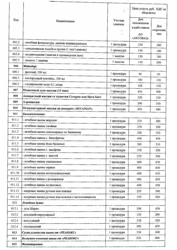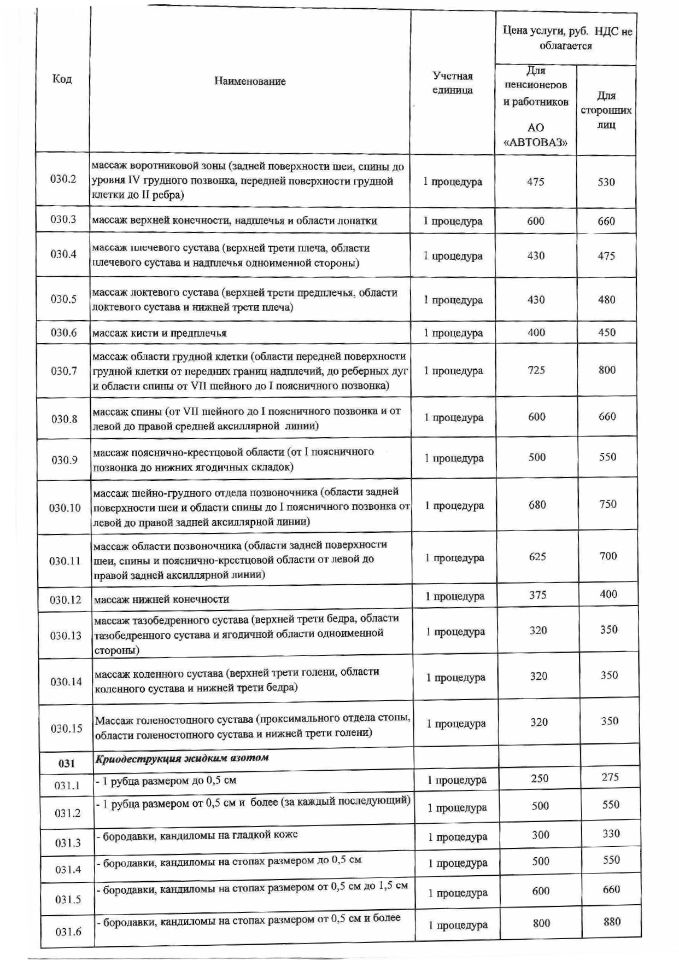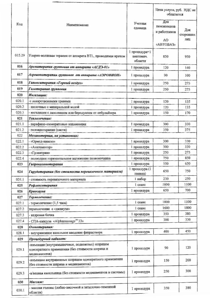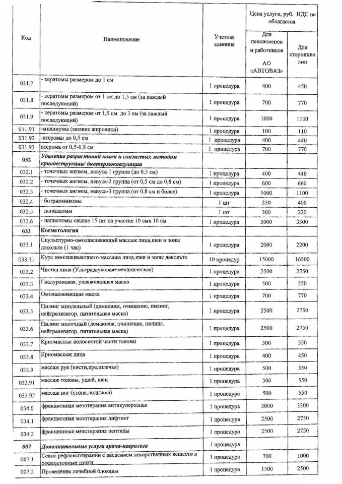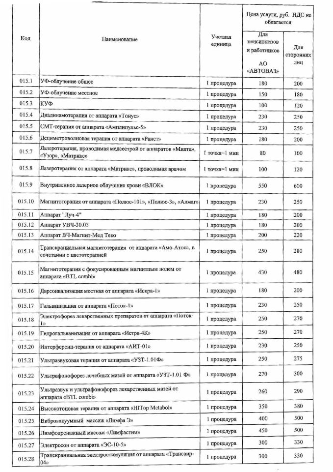| Наименование услуги | Учётная единица | Цена для пенсионеров и сотрудников АО АВТОВАЗ (руб. НДС не облагается) | Цена для сторонних лиц (руб. НДС не облагается) | |